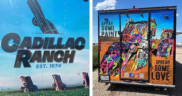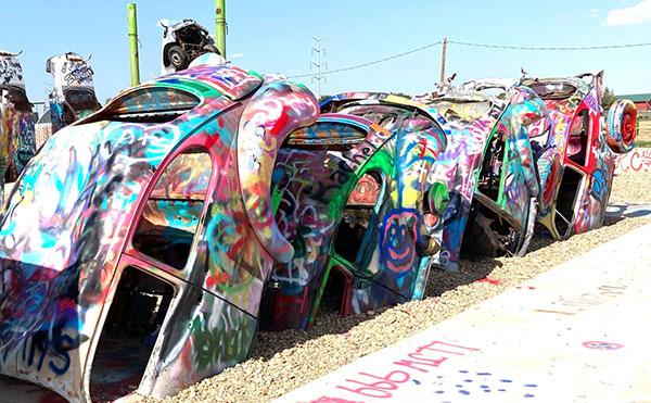 I read that the Cadillacs are periodically painted different colors. Once they were all given a coat of white for the filming of a TV commercial. Another time they were painted pink in honor of the birthday of Marsh’s wife Wendy. And when the artist Doug Michels died, the cars were colored black to mark his passing. Sometimes the Cadillacs are painted a solid color simply to provide a fresh canvas for future visitors.