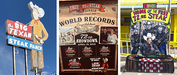During the meal that Thea and I enjoyed at the Big Texan, two men sat at the restaurant’s elevated head table under a time clock and took up the 72-ounce challenge. Neither could choke down all that meat in one hour, so each had to cough up $72.00 to pay for his meal. Wisely, I think, Thea and I stuck to more reasonable portions.